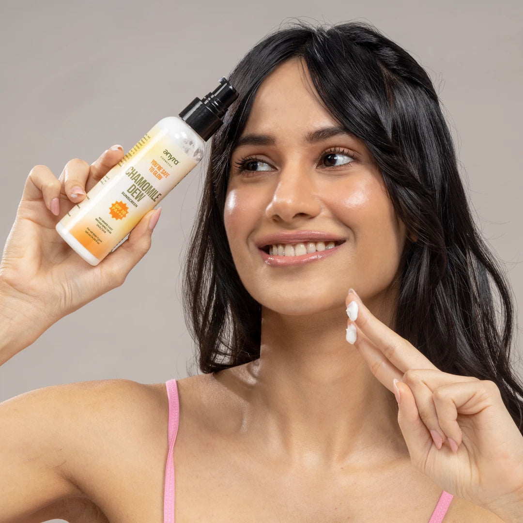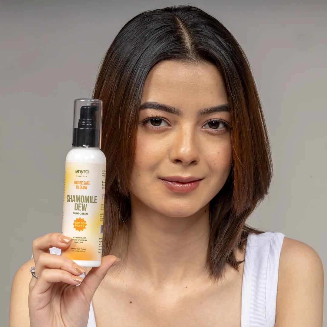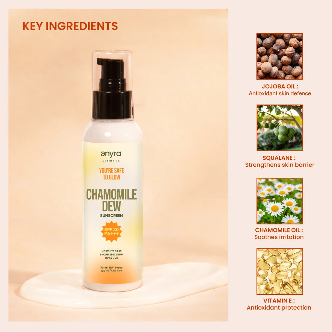 Experience the luxury of Chamomile Dew Sunscreen, a premium, lightweight formula with SPF 30 designed for daily protection and care. Jojoba Oil nourishes and balances, Squalane strengthens the skin barrier, and Chamomile Oil soothes sensitive, irritated skin. Enriched with Vitamin E, it shields against free radicals while keeping skin soft, smooth, and radiant. Non-greasy and fast-absorbing, this sunscreen offers superior sun protection and skincare benefits- a worthwhile upgrade for healthy, glowing skin.