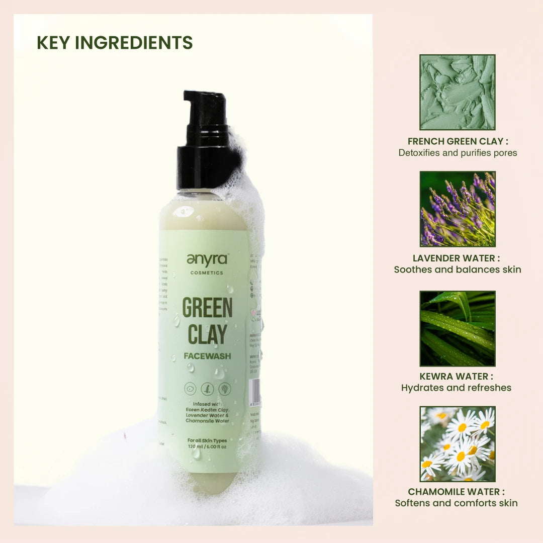 Indulge your skin with the Green Clay Face Wash, a refreshing, detoxifying cleanser designed to purify, balance, and revive oily and acne-prone skin. Powered by French Green Clay, it deeply cleanses pores, absorbs excess oil, and removes impurities without disrupting the skin’s natural moisture balance. Enriched with calming Lavender Water, hydrating Kewra Water, soothing Chamomile Water, and aromatic Lavender Oil, it leaves your skin feeling fresh, clarified, smooth, and comfortably balanced.