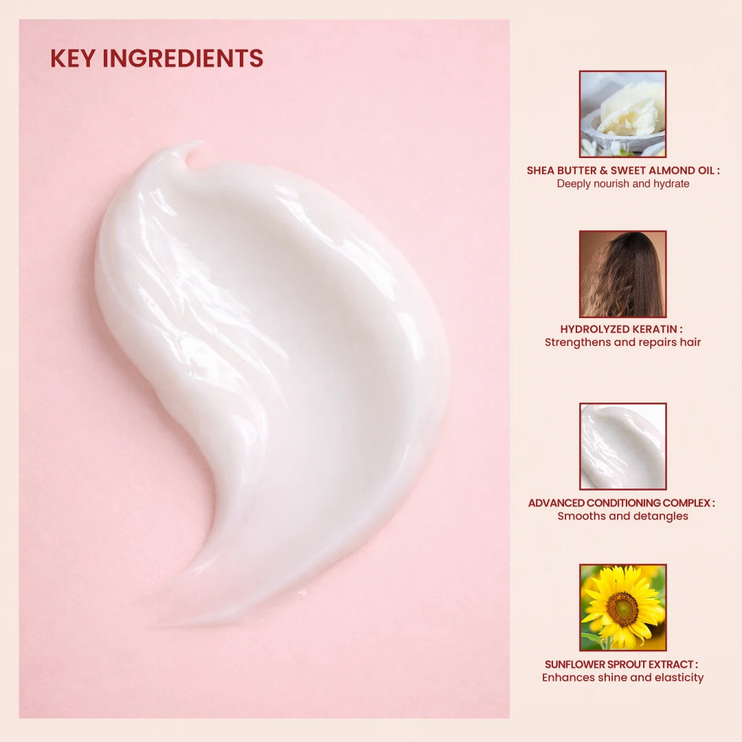Infused with Shea Butter, Sweet Almond Oil and Sunflower Sprout Extract, this sumptuous conditioner delivers deep nourishment and velvety smoothness to damaged strands. Hydrolyzed Keratin strengthens from within, restoring resilience and luminous shine, while a serene blend of Bergamot, Lavender, Clary Sage, Vanilla, and Ylang-Ylang oils harmonizes the scalp and envelops the senses in an elegant, lingering fragrance.